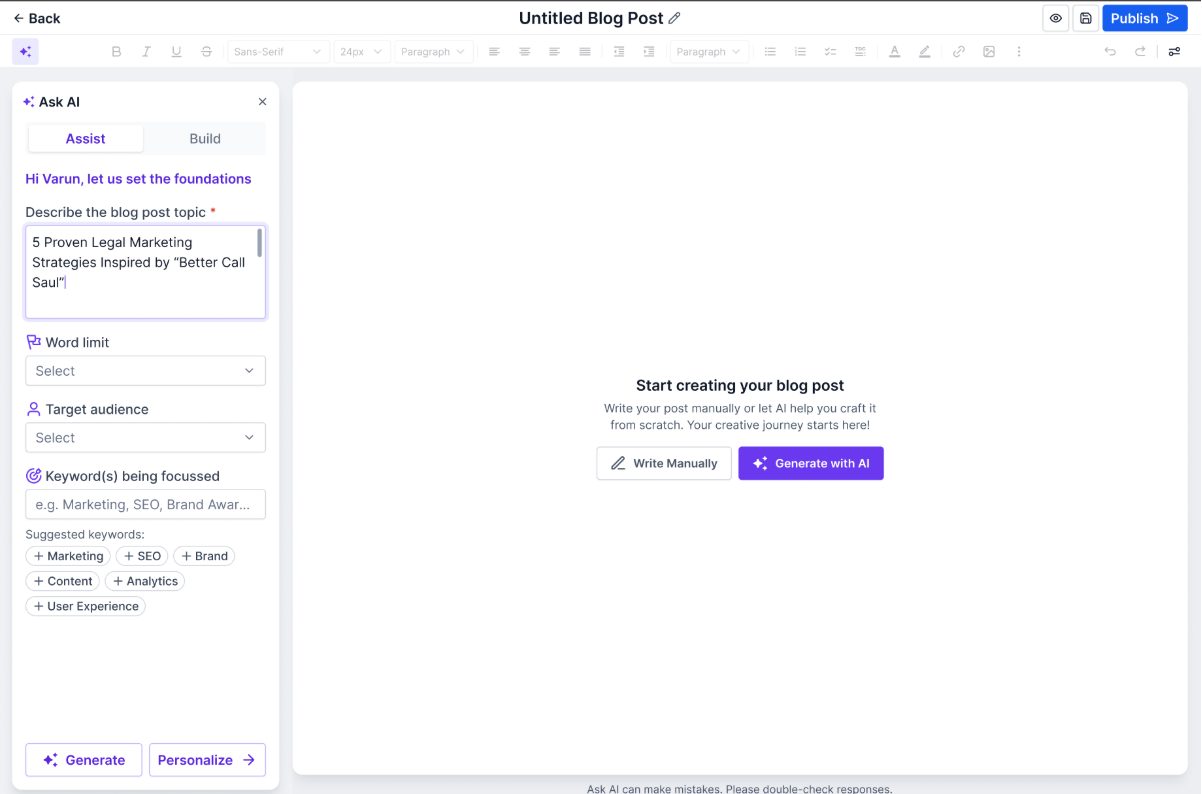 Create SEO-friendly blog posts faster with Blog Post AI. This built-in writing assistant helps you generate, refine, and publish blog content directly inside the Blog Editor, so you can move from idea to draft without switching tools.